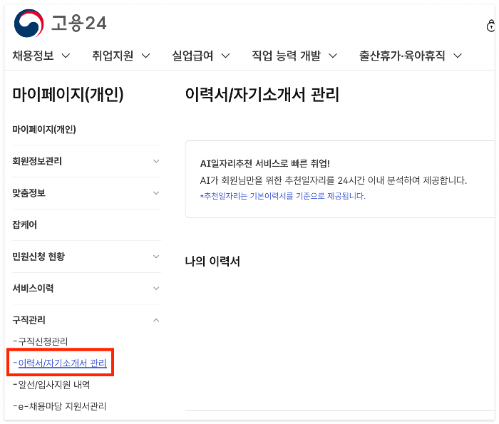 고용24 → 로그인 → 마이페이지 → 이력서/자기소개서 관리