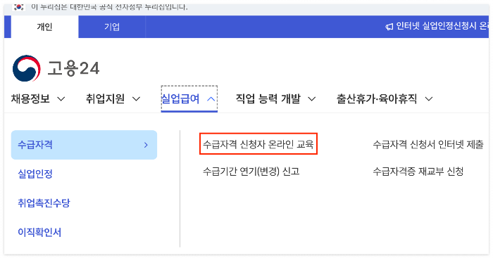 고용보험 홈페이지 → 실업급여→ 수급자격 → ‘수급자격 신청자 온라인 교육’ 수강